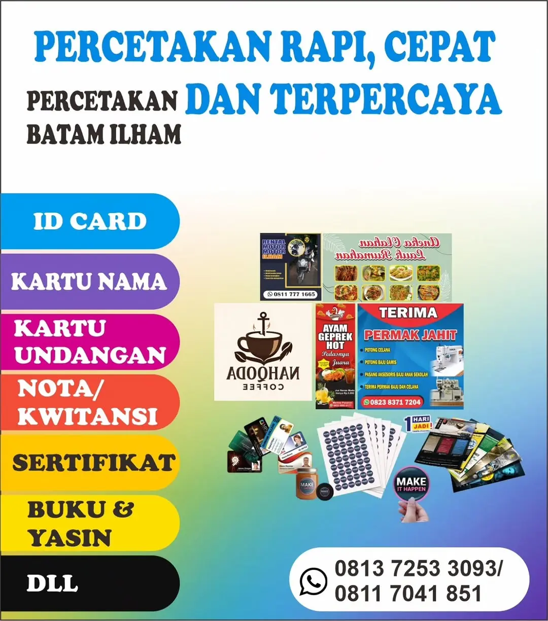 Percetakan Batam Ilham adalah pusat layanan Digital Printing dan percetakan terpercaya yang berlokasi strategis di Batam Center. Kami hadir sebagai solusi cetak satu atap (one-stop printing solution) untuk kebutuhan personal, bisnis, hingga korporasi. Dengan dukungan mesin cetak modern dan tim profesional, kami berkomitmen memberikan hasil cetak yang tajam, berkualitas, serta layanan "Cetak Kilat" yang praktis dan cepat. Mulai dari kebutuhan promosi usaha seperti spanduk dan banner, hingga kebutuhan personal seperti undangan dan buku Yasin, kami siap melayani Anda dengan harga yang bersahabat.