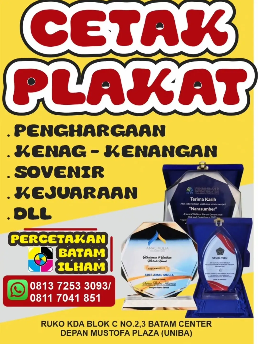 Percetakan Batam Ilham adalah pusat layanan Digital Printing dan percetakan terpercaya yang berlokasi strategis di Batam Center. Kami hadir sebagai solusi cetak satu atap (one-stop printing solution) untuk kebutuhan personal, bisnis, hingga korporasi. Dengan dukungan mesin cetak modern dan tim profesional, kami berkomitmen memberikan hasil cetak yang tajam, berkualitas, serta layanan "Cetak Kilat" yang praktis dan cepat. Mulai dari kebutuhan promosi usaha seperti spanduk dan banner, hingga kebutuhan personal seperti undangan dan buku Yasin, kami siap melayani Anda dengan harga yang bersahabat.